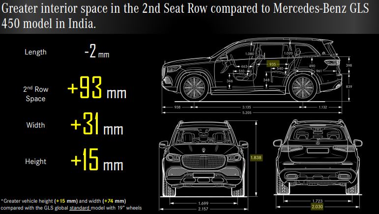 Mercedes-Benz Maybach GLS 600 comes with additional space and comfort. Dimensionally it is slightly shorter than the Mercedes-Benz GLS 450 but wider and taller. The Maybach GLS 600 comes with 2 mm of shorter length at 5,205 mm. It gets 93 mm of extra space for the second-row occupants adding more knee room and leg space. The width of the car has been increased by 31 mm at 2,030 mm and the height too has been increased 15 mm at 1,838 mm.