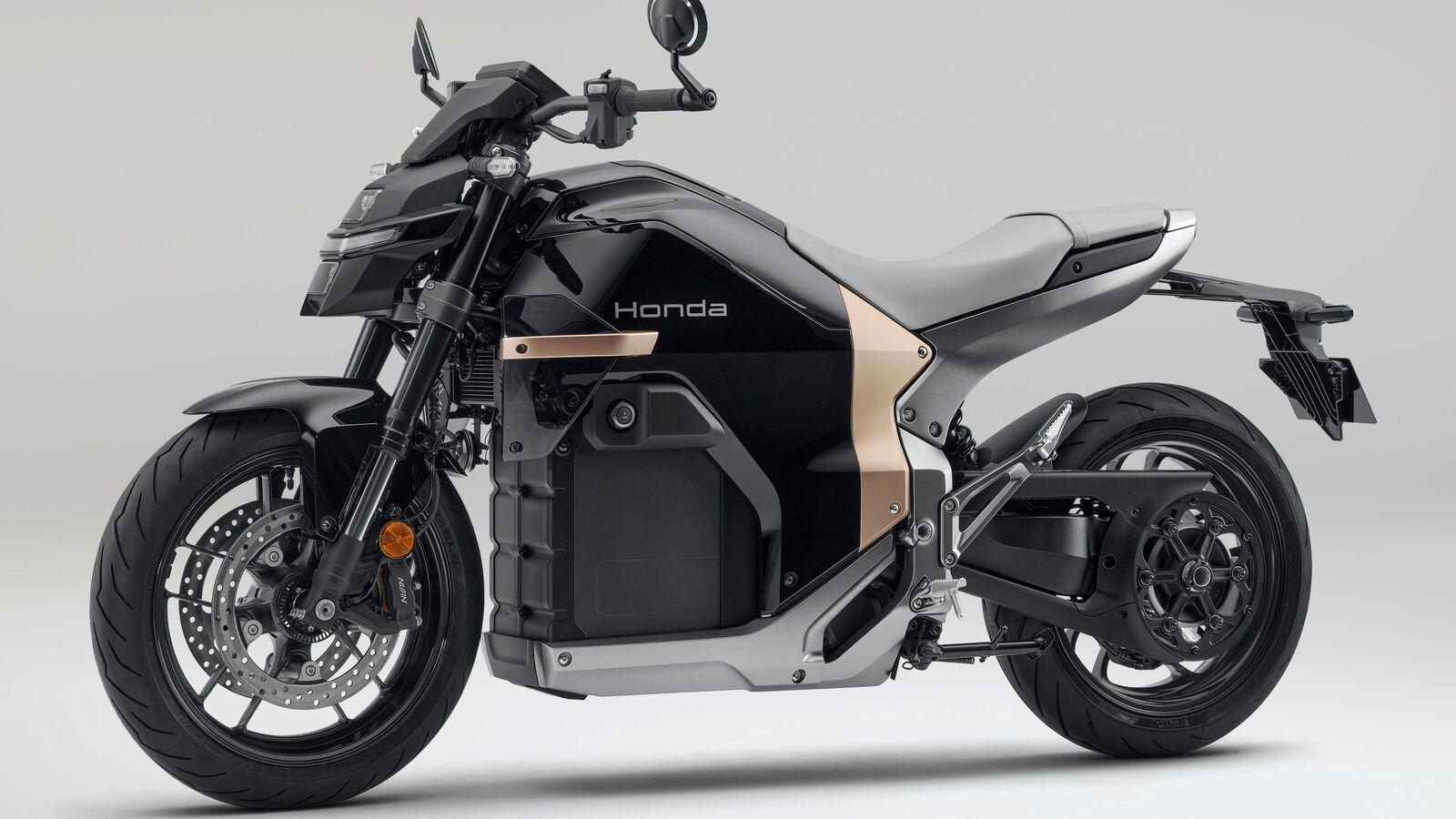 The bike features an unmistakable silhouette defined by smooth surfaces and a black-coloured with gold components for contrast. The front end features a horizontal LED light bar, which is said to serve as the signature design element in future Honda electric bikes.