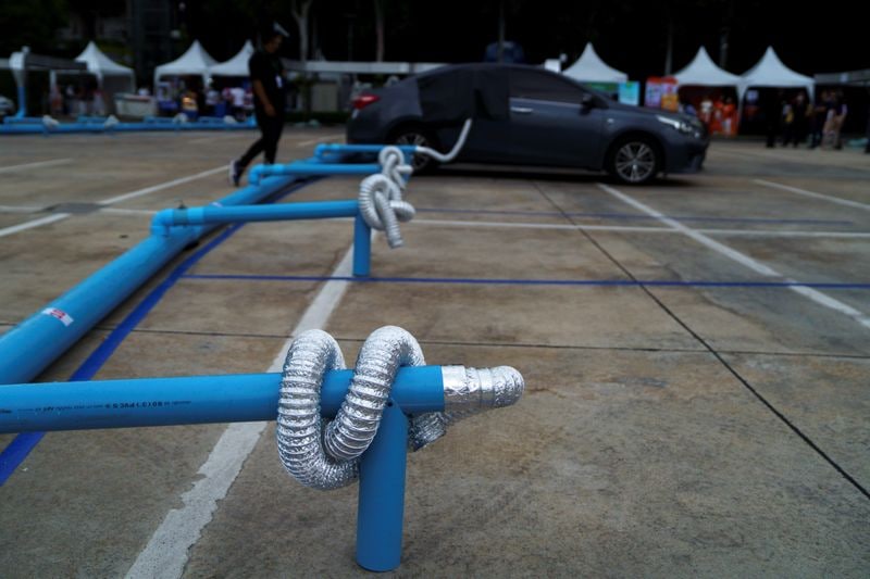 To beat the tropical heat, organisers created a network of plastic pipes in the parking lot connected to dozens of smaller, flexible tubes, to channel cool air into cars through gaps in the windows.