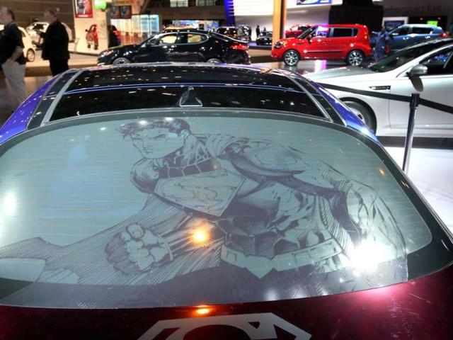The rear window displays Superman of the Kia DC Comics Superman Edition Optima Hybrid at the Chicago Auto Show in Chicago. (AFP Photo)