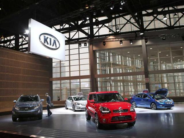 A visitor looks over cars in the Kia display during the media preview at the Chicago Auto Show in Chicago. (AFP Photo)
