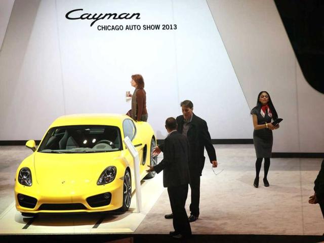 Visitors look over the Porsche Cayman during a media preview day at the Chicago Auto Show in Chicago. (AFP Photo)