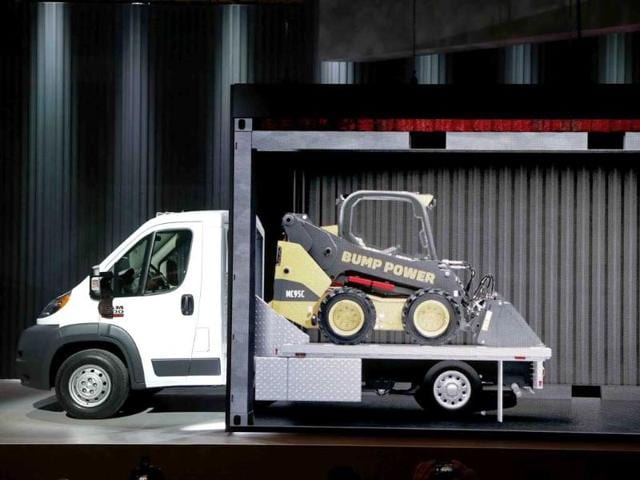 A projection screen shows one of the multiple chassis cab configurations that can be manufactured for the 2014 Ram ProMaster 3500 at the Chicago Auto Show in Chicago. (AP Photo)