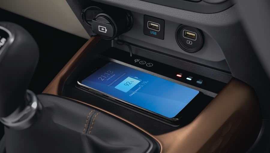 Wireless charging, leather-wrapped gear knob, eco coating, emergency stop signal, air curtain, iBlue Audio Remote phone app, Arkamys' four mode sound are some of the segment firsts inside the Aura.